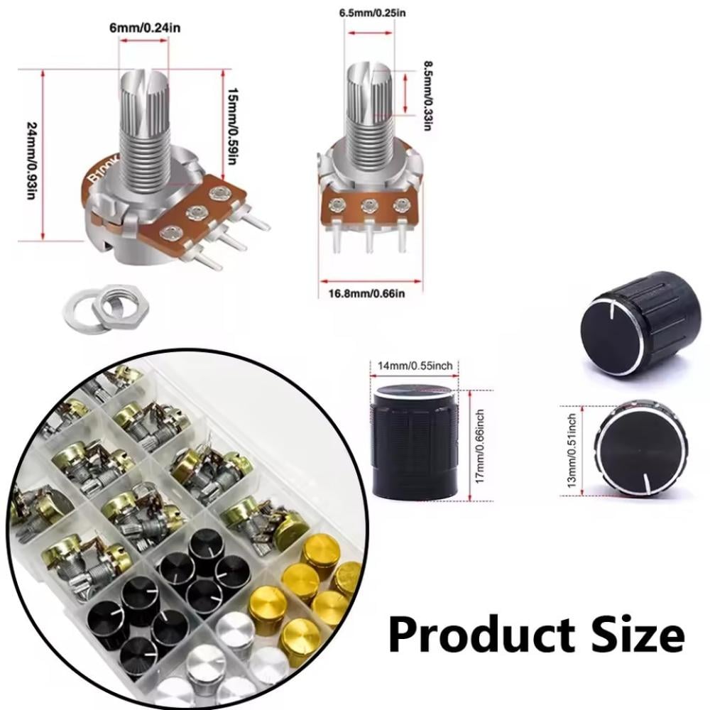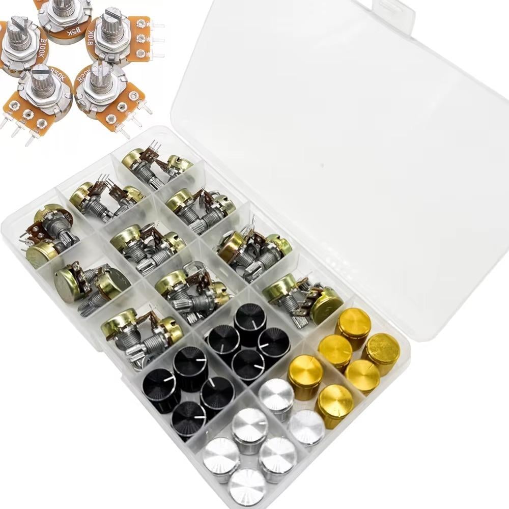 مجموعة شاملة من مقاومات الجهد المتغيرة (Potentiometers) من النوع B (خطي)، متوفرة بقيم مختلفة من 5KΩ حتى 100KΩ لتناسب مختلف المشاريع الإلكترونية.