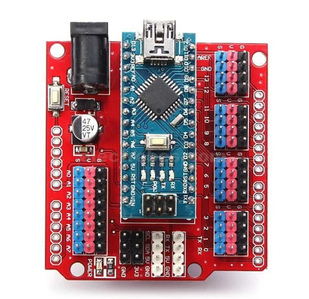 درع حساسات يعمل كلوح توسعة يمكنك من استضافة المزيد من الأجهزة الطرفية والحساسات للتطبيقات المختلفة. بالإضافة الى سهولة تركيب الأردوينو نانو والحساسات المختلفة في الدرع، فهذا الدرع متوافق مع الاصدار الثاني v2 والثالث v3 من نانو.