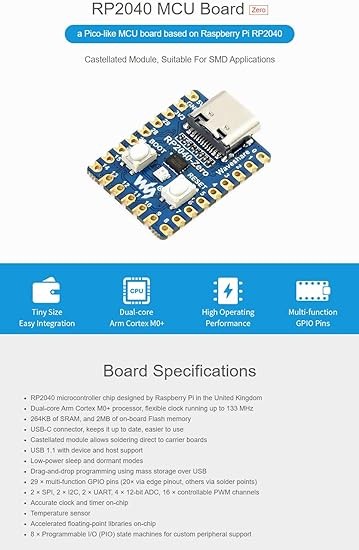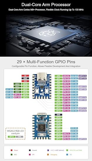 شريحة التحكم الدقيقة RP2040 مصممة بواسطة Raspberry Pi في المملكة المتحدة. معالج Arm Cortex M0+ ثنائي النواة، وساعة مرنة تصل سرعتها إلى 133 ميجاهرتز