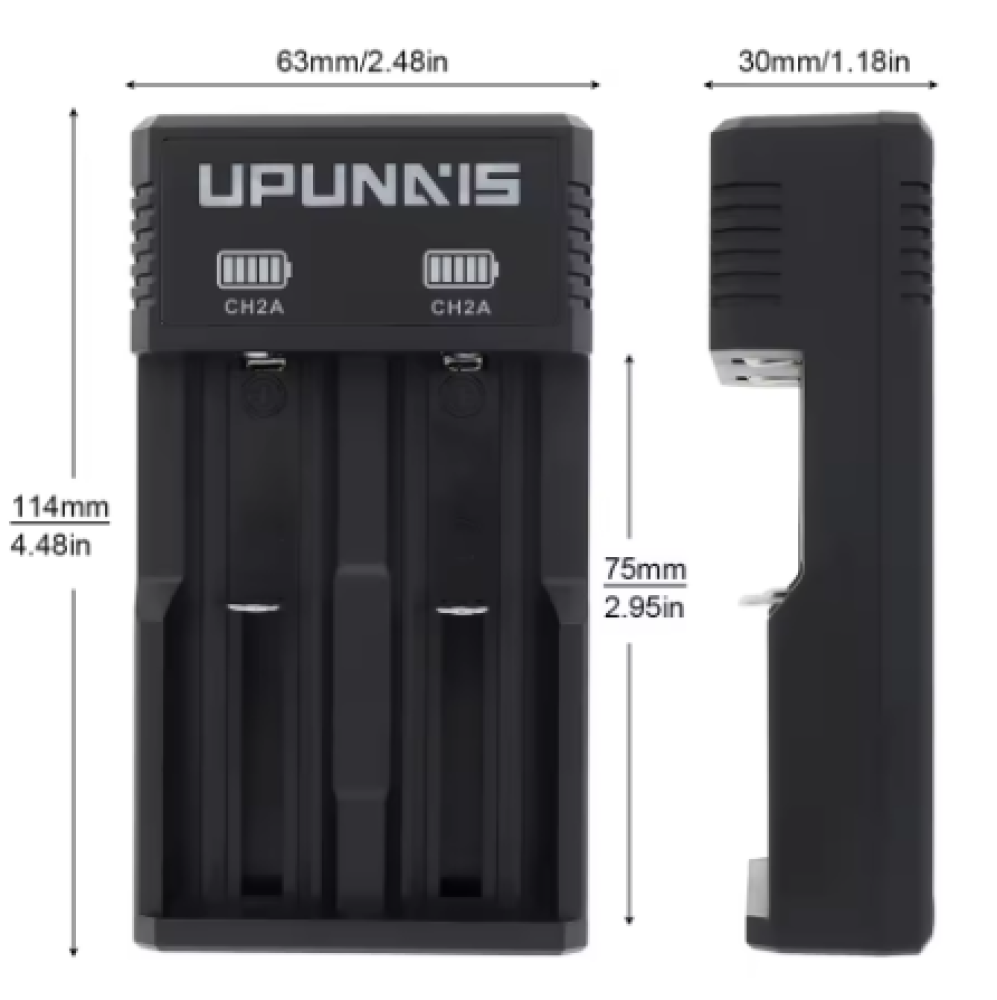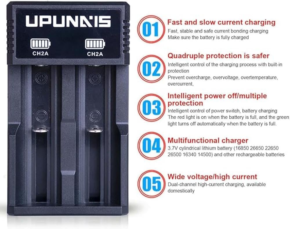 يمكن للشاحن الشامل شحن أحجام متعددة من البطاريات، مثل بطاريات الليثيوم 18650 و14500 و17500 و18500 و17670. من خلال استخدام البطارية والشاحن القابلين لإعادة الشحن،