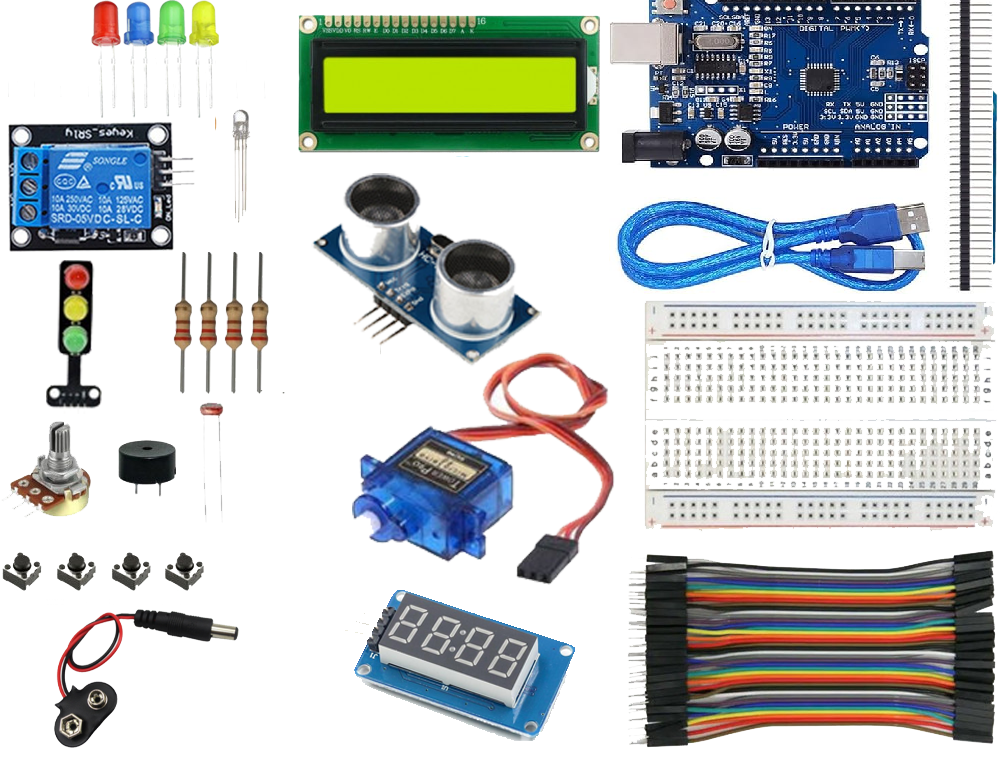 حقيبة ورشة عمل حيث تحتوي الحقيبة على مجموعة مختلفة من الحساسات والملحقات والعناصر الالكترونية لعمل تجارب وتمارين ممتعة